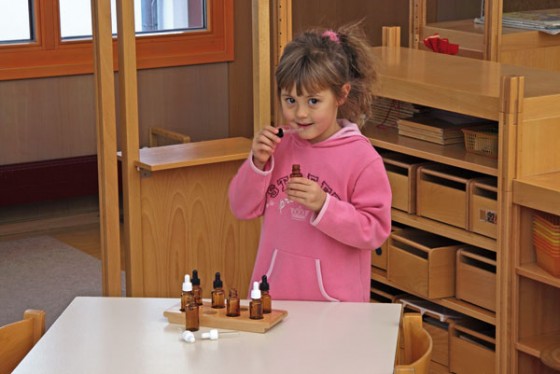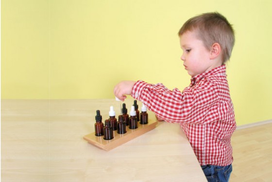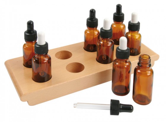 In die 8 Fläschchen werden verschiedene Flüssigkeiten wie z.B. Essig oder Kirschsaft gefüllt. Die Kinder tropfen mit der Pipette auf den Handrücken oder einen Löffel und bewerten den Geschmack. Bei paarweiser Befüllung auch als Zuordnungsübung geeignet.