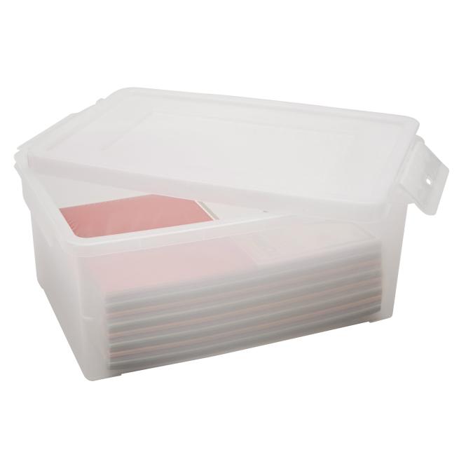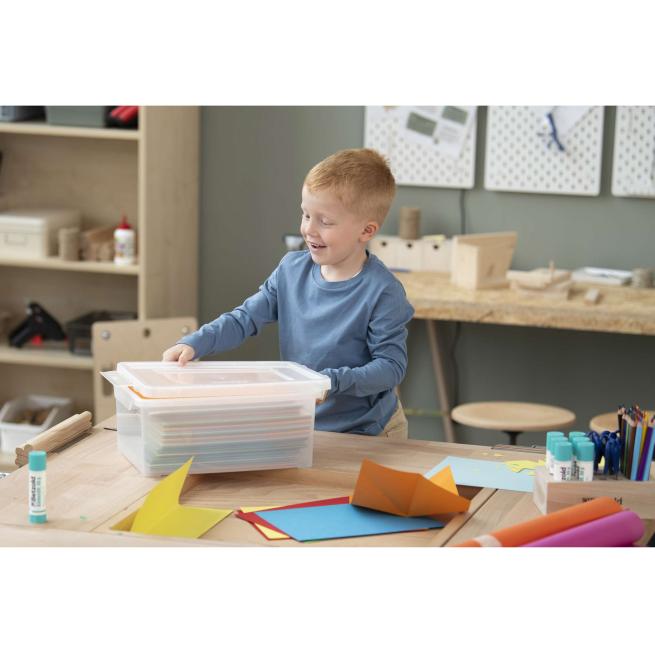 Ob DIN-A4-Unterlagen, Tonkarton oder Bastelmaterial – in dieser Box bleibt alles ordentlich verstaut. Dank des stabilen Klick-Deckels ist der Inhalt sicher geschützt, während die weiß-transparente Optik Ihnen einen schnellen Überblick verschafft. Die Boxen lassen sich platzsparend stapeln und mühelos von Hand reinigen. Eine smarte und nachhaltige Wahl für mehr Struktur im Klassenzimmer oder Büro!Produktdetails