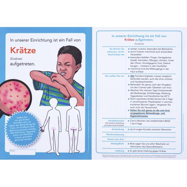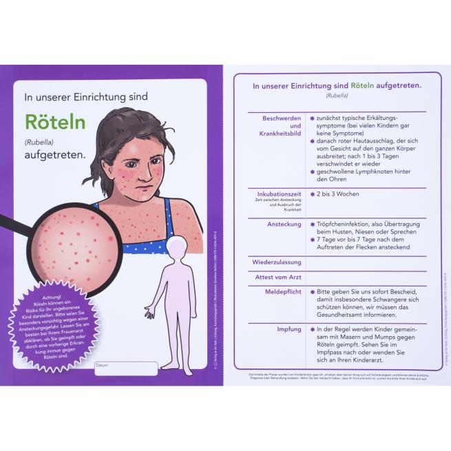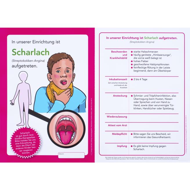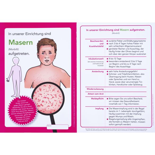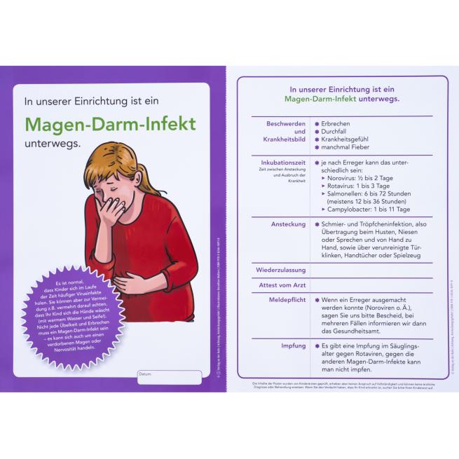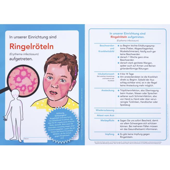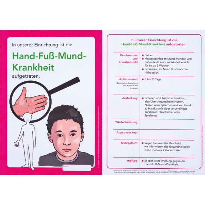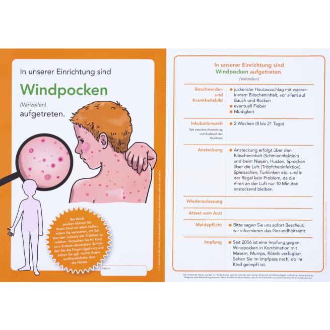 Ob Röteln oder Hand-Mund-Fuß – dank der 16 Poster sind Sie bestens informiert. Pointiert führen die Poster die verschiedenen Krankheitsbilder, Inkubationszeiten, Ansteckungswege, Wiederzulassungen, Attest- und Meldepflichten sowie Impfungen auf. Individuelle Regelungen Ihrer Einrichtung, wie die Wiederzulassung und die Einreichung eines Attestes vom Arzt, können Sie auf den speziell beschichteten Oberflächen mit abwischbaren Folienstiften hinzufügen. Inklusive Kopiervorlagen als Elternbrief. Eine extra Blanko-Klappkarte für ein Thema, welches hier nicht behandelt wird, liegt bei, zum individuellen Ausfüllen.