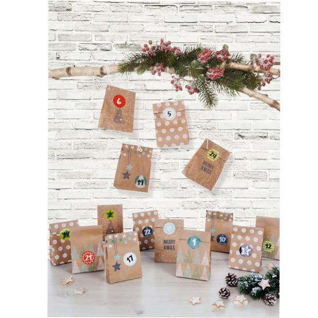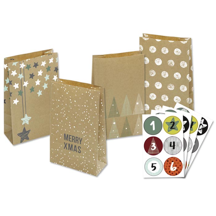 Einfach schick. Im Handumdrehen befüllen Sie die 24 lebensmittelechten Papiertüten im Stern-, Tannenbaum-, Schneeball- und Schriftzug-Design mit kleinen Geschenken und verschließen sie mit den Zahlenaufklebern. Voilà, fertig ist der Tüten-Adventskalender.