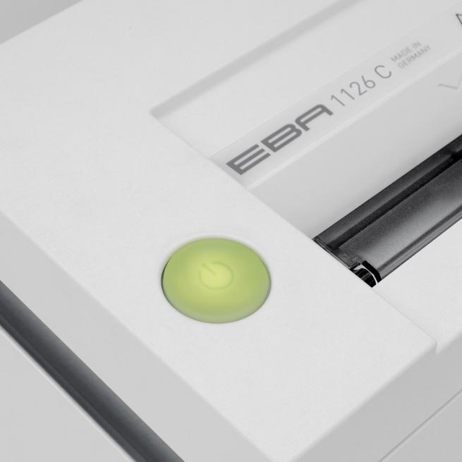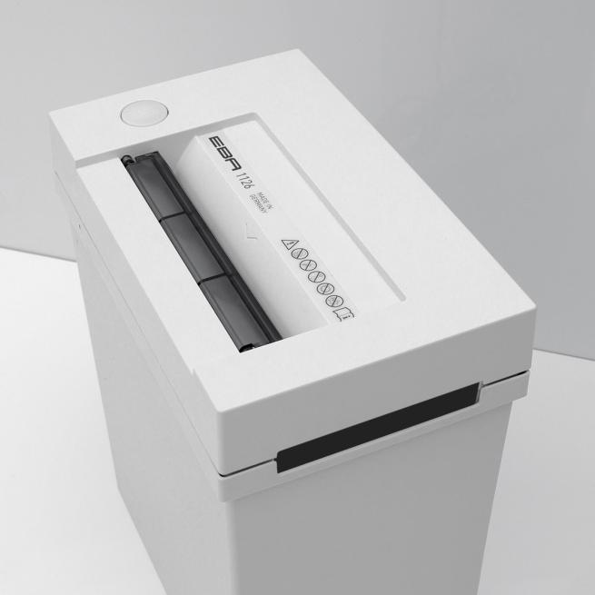EBA 1126 C: P-4 (3x25 mm Partikelschnitt): Diese Variante zerkleinert Ihre vertraulichen Papierdokumente bis Sicherheitsstufe P-4 (besonders sensible und vertrauliche Daten) DSGVO-gerecht und an den Vorgaben der Norm DIN-66399 orientiert im 3x25 mm Partikelschnitt. Arbeitsgeschwindigkeit: 5 – 6 Blatt Normalpapier in der Minute. Ebenfalls praktisch: Heben Sie den Gerätekopf (Schreddereinheit) vom Schnittgutbehälter versehentlich im laufenden Betrieb ab, geht der Schredder automatisch aus – dank cleverem Magnetschalter.