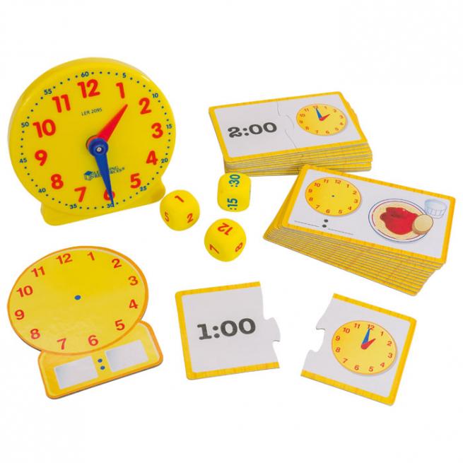 Großer Zeiger, kleiner Zeiger, einer dreht sich langsamer, der andere schneller und beide zeigen dieselbe Uhrzeit an wie digitale Ziffern. Wie liest man eigentlich die analoge Uhr? Ihren Schülern zeigen Sie dies ganz anschaulich mit diesem Set. Auf analogen und digitalen Uhren lernen Ihre Schüler, die Uhrzeit in halben und ganzen Stunden zu erkennen. Die Zeiger haben zur Unterscheidung unterschiedliche Farben.