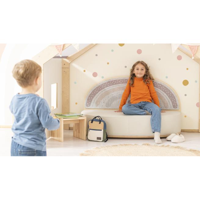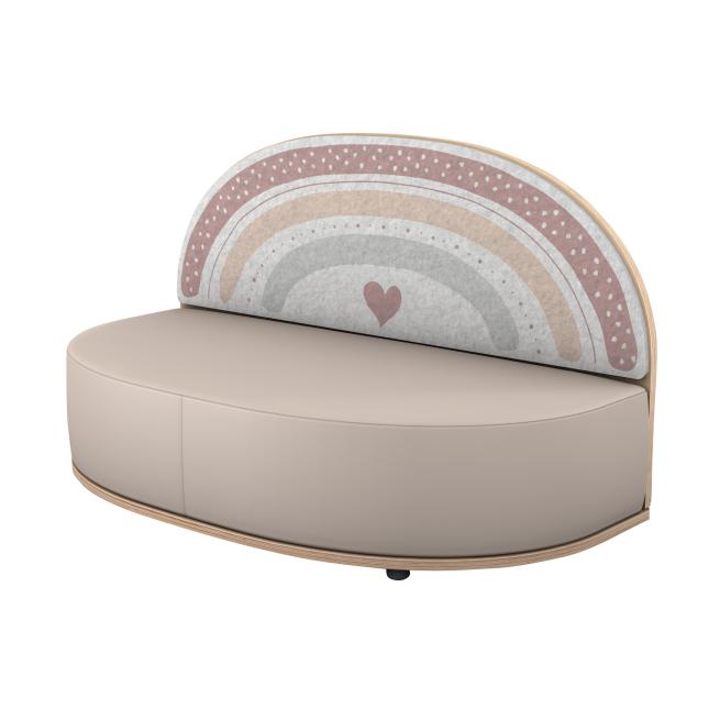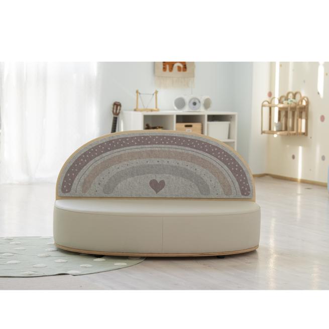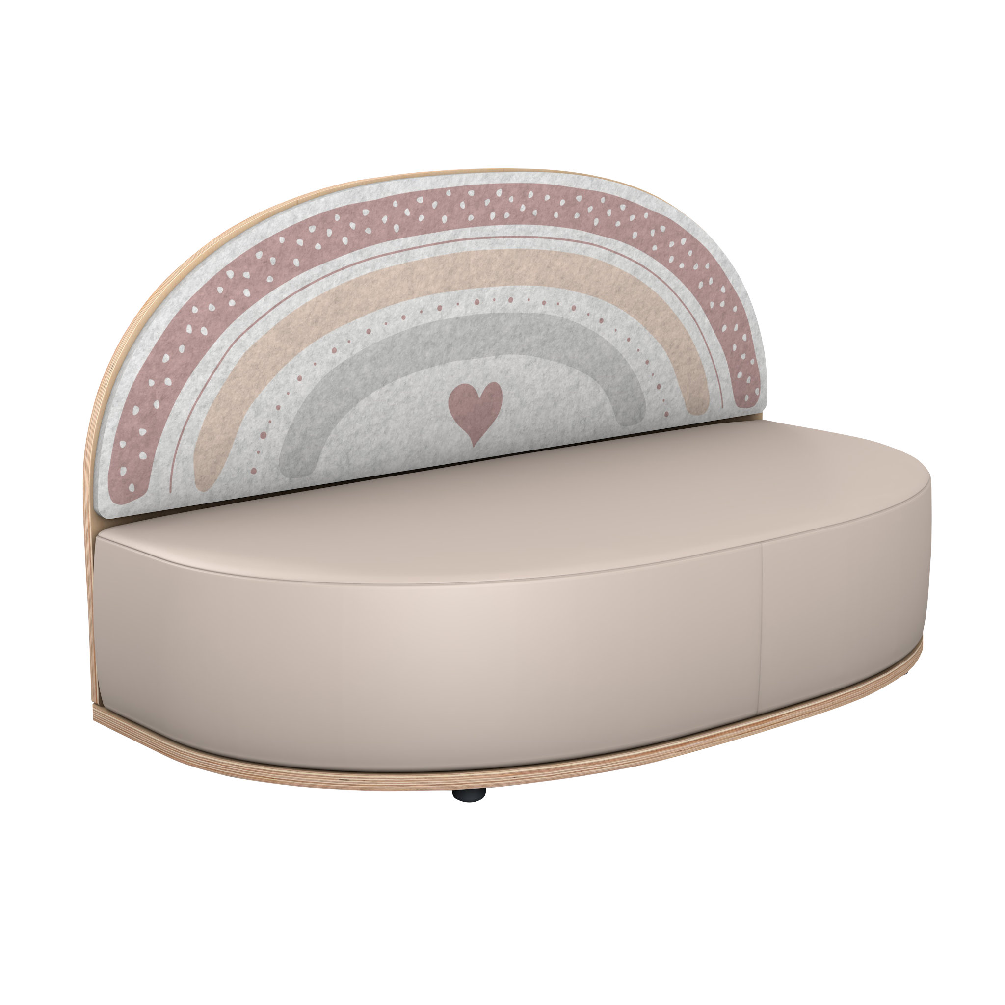 Chillen unter dem Regenbogen. Das Akustiksofa bietet Ihren Kindern den absoluten Wohlfühlplatz, um in Ruhe ein Buch anzuschauen oder zum Entspannen. Der Clou: Das neue Lieblingssofa hat nicht nur einen stabilen Holzunterbau, sondern auch eine hochgezogene Rückenlehne mit Akustikmaterial. Dies schluckt den Schall und reduziert den Geräuschpegel merklich. Zudem bietet der feste Schaumstoff bequemen Sitzkomfort und der phthalatfreie Kunstlederbezug ist besonders hygienisch sowie schwer entflammbar. Teilmontiert.