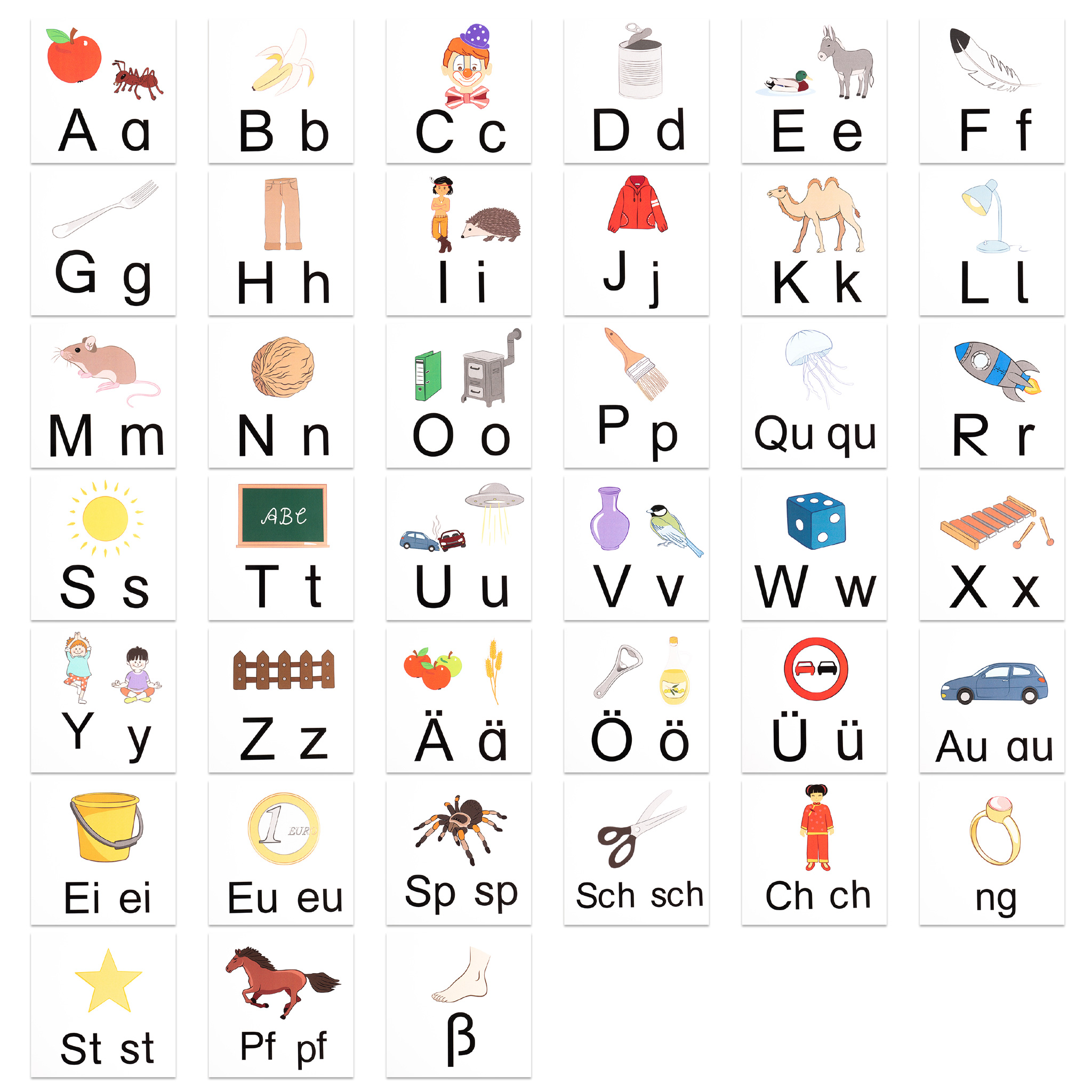 Die Buchstaben- und Anlaut-Karten sind ideal zum Kennenlernen und Einführen der Buchstaben. Die Buchstaben (groß und klein) werden zusammen mit einem Anlaut-Bild auf einer Karte gezeigt.
