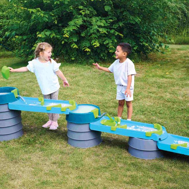 Aus den verschiedenen Bauteilen und Gestaltungselementen konstruieren die Kinder immer wieder neue Strecken. Drehbare Wasserbecken, Schleusen, bewegliche Ablaufrohre oder die kleinen Schieber ermöglichen dabei laufende Modifikationen der Fließrichtungen sowie vielfältige Experimente. Dabei nutzen die Kinder neben Wasser auch viele weitere Naturmaterialien, z. B. Sand, Erde, Blätter und mehr.
