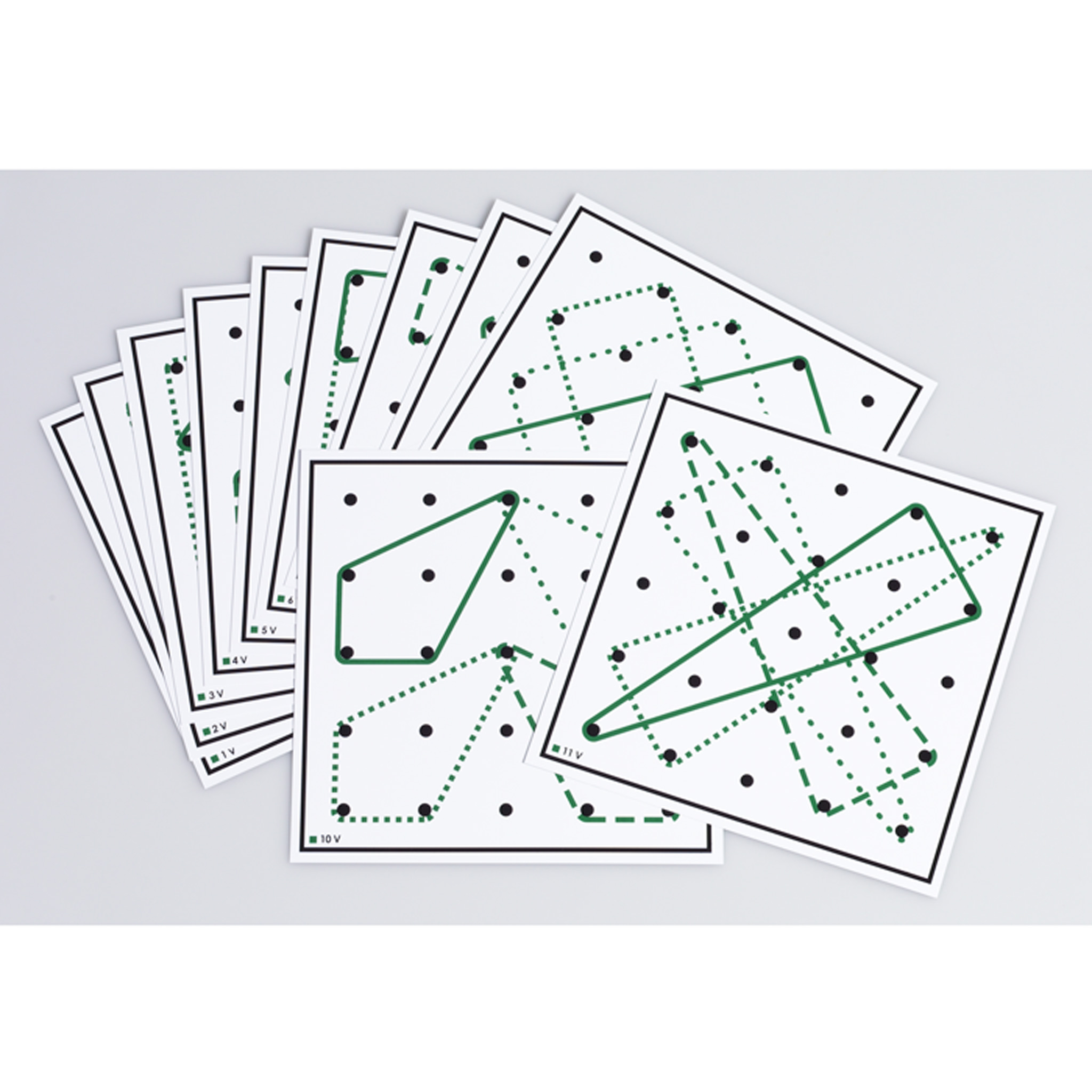Die Arbeitskarten legen Ihre SuS einfach unter ein transparentes Geometriebrett (bitte separat bestellen). Mit 1, 2 oder mehreren Gummibändern spannen sie dann unterschiedliche Flächen oder Formen nach oder führen sogar Übungen zur Spiegelsymmetrie durch. Je 12 Stück, beidseitig bedruckt, aus stabilem Karton.