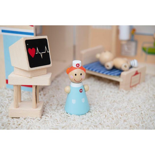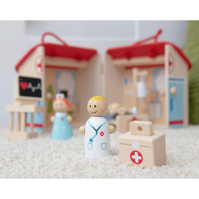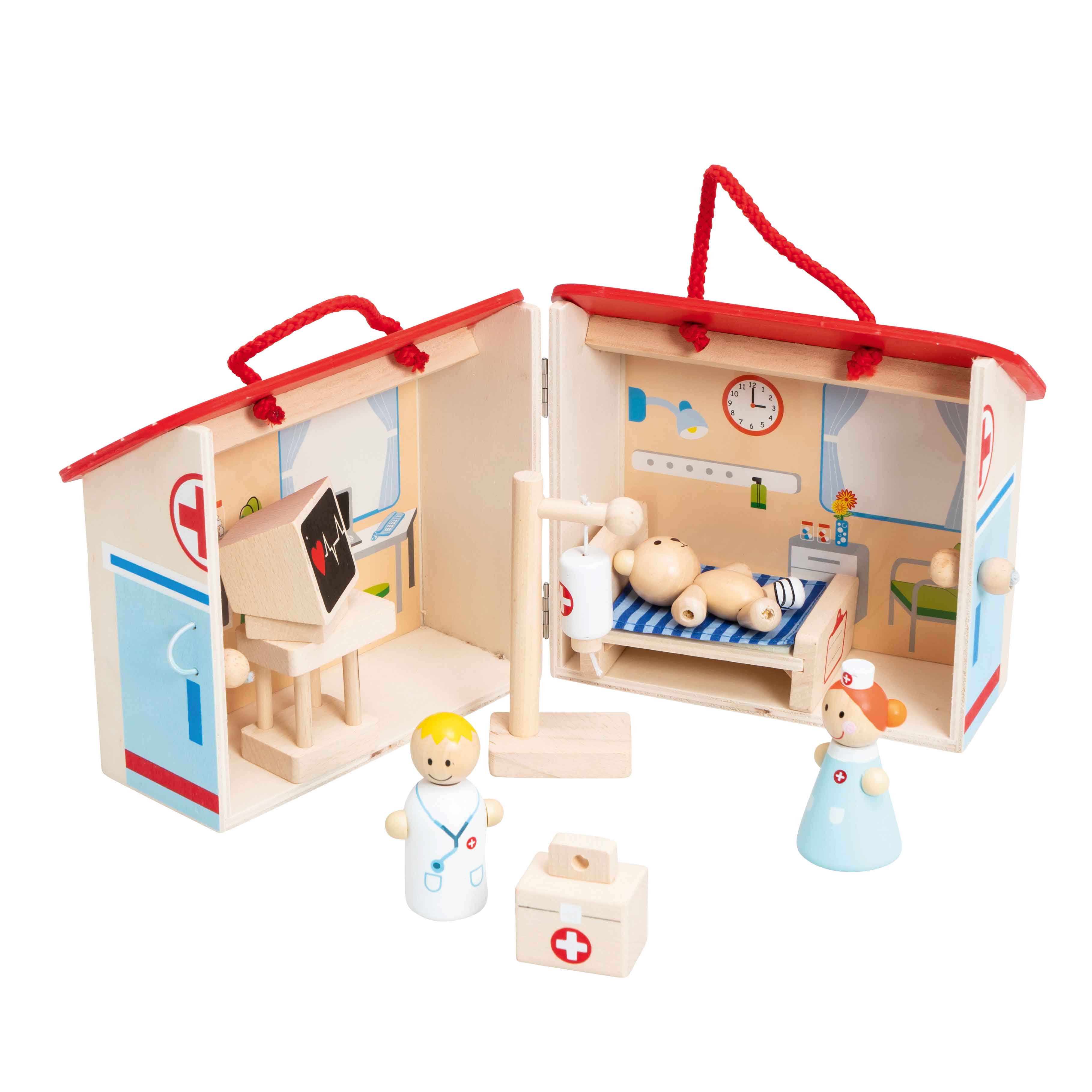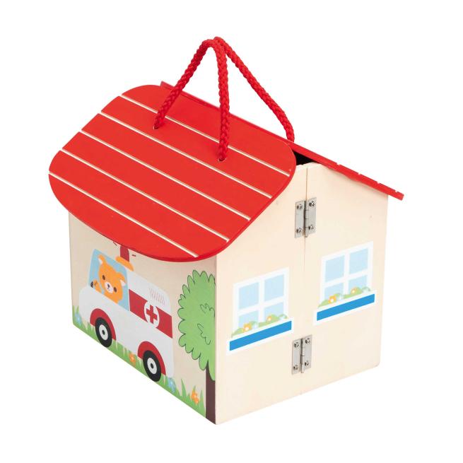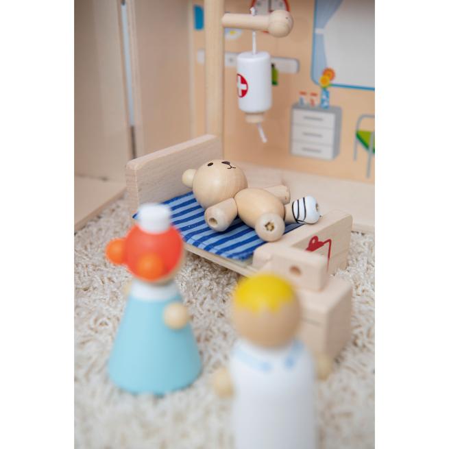 Dass sie vor Arztbesuchen keine Angst haben müssen, lernen Kinder anschaulich im Rollenspiel mit der tragbaren Arztpraxis. Beim Aufklappen entfaltet sich ein freundliches Ambiente. Arzt und Krankenschwester kümmern sich konzentriert um die Verletzungen des kleinen Bären. Seine Herzfrequenz überwachen sie aufmerksam über den Monitor. Vorsorglich liegt der Bär im Bett und erhält eine Infusion.