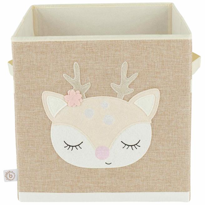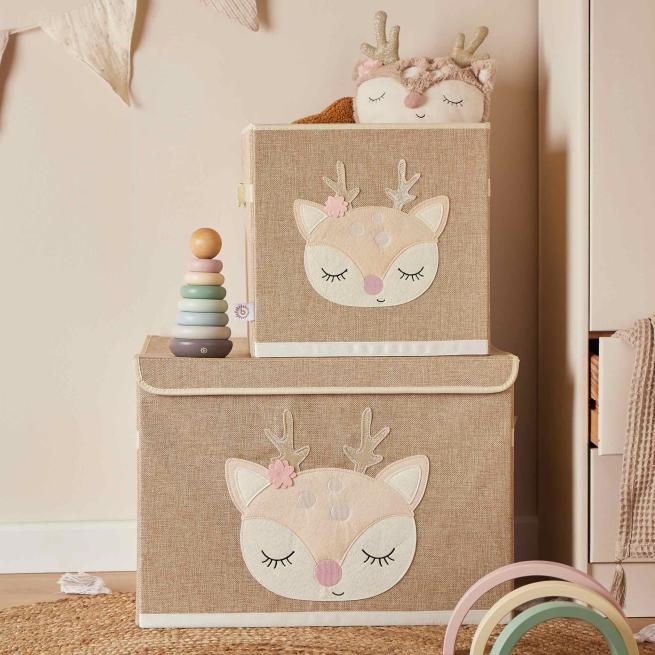 In der Aufbewahrungsbox mit 33 l Fassungsvermögen ist ordentlich Platz für die liebsten Spielsachen Ihrer Kinder. Der schicke Leinen-Look fügt sich gut in Ihre Räumlichkeiten ein. Das Löwe- oder Reh-Motiv ist ein drolliger Blickfang. An den Tragegriffen transportieren Sie die Box leicht. Zusammenklappbar und mit einem nebelfeuchten Tuch abwischbar. Passt auch in das bekannte Regal mit den quadratischen Fächern eines schwedischen Möbelhauses.