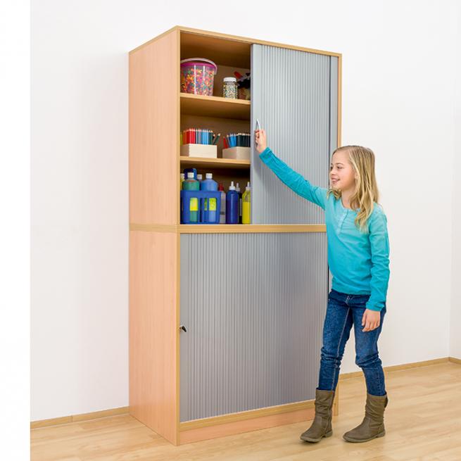 Mehr Ordnung. Mit den Aufsatzschränken stocken Sie sämtliche Ihrer Regale und Schränke auf und schaffen einfach noch mehr Stauraum, indem Sie die Raumhöhe optimal ausnutzen. Die Aufsatzschränke werden vormontiert und auf dem entsprechenden Schrank oder Regal fest verschraubt. Die Rückwand ist 19 mm stark und sorgt für Stabilität. Die qualitativ hochwertige Melaminharzbeschichtung ist robust und trotzt den jahrelangen schulalltäglichen Belastungen. Abnutzungserscheinungen werden durch die 2 mm ABS-Kante verhindert, denn sie bietet Schutz vor Stößen und Feuchtigkeit. Verschmutzungen wischen Sie einfach feucht ab.