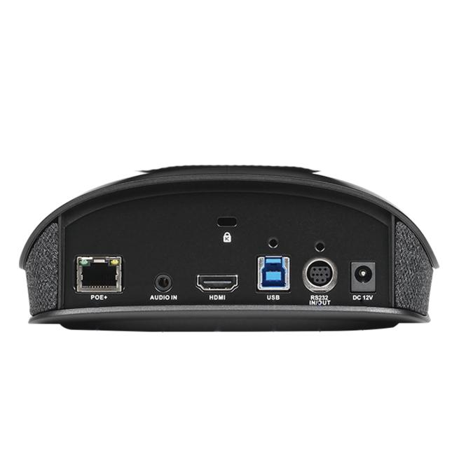 Für vielseitige Konnektivität verfügt die Kamera über Anschlüsse für HDMI, USB, RS232 und LAN-Kabel (z. B. für IP-Verbindungen oder zur Stromversorgung via PoE+), einen 3,5-mm-Audio-Eingang sowie eine 12-V-DC-Buchse zum Anschluss kompatibler Steckernetzteile.