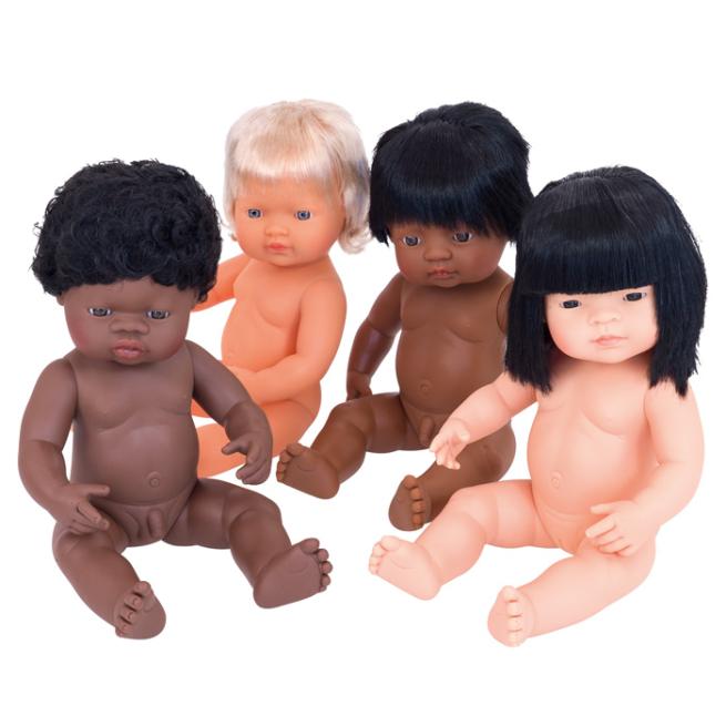 Auf der ganzen Welt haben die Menschen unterschiedliche Hautfarben, das sieht jeder. Aber warum ist das so? Und warum sind manche Menschen blond? Die Baby-Puppen helfen Ihnen, mit Ihren Kindern ins Gespräch zu kommen. Jede der vier Puppen repräsentiert eine andere ethnische Gruppe. Spielerisch lernen die Kinder die globale Vielfalt kennen. Die liebevoll gestalteten Baby-Puppen erhalten Sie als Set oder einzeln. Ideal geeignet auch zum freien Spielen. Der weiche Puppenkörper aus Vinyl duftet leicht nach Vanille. Ab 12 Monaten.