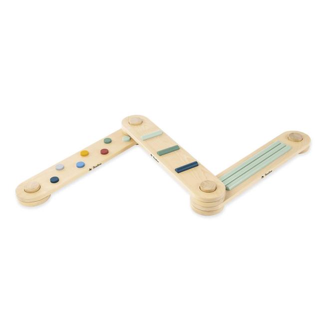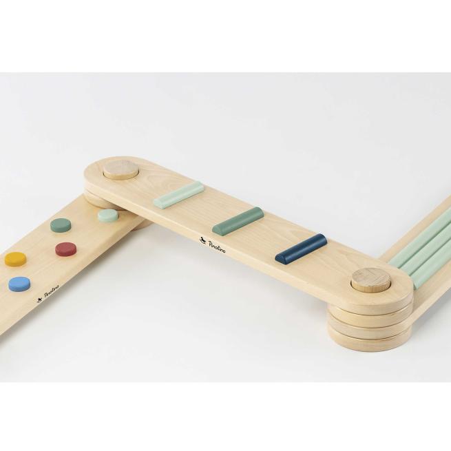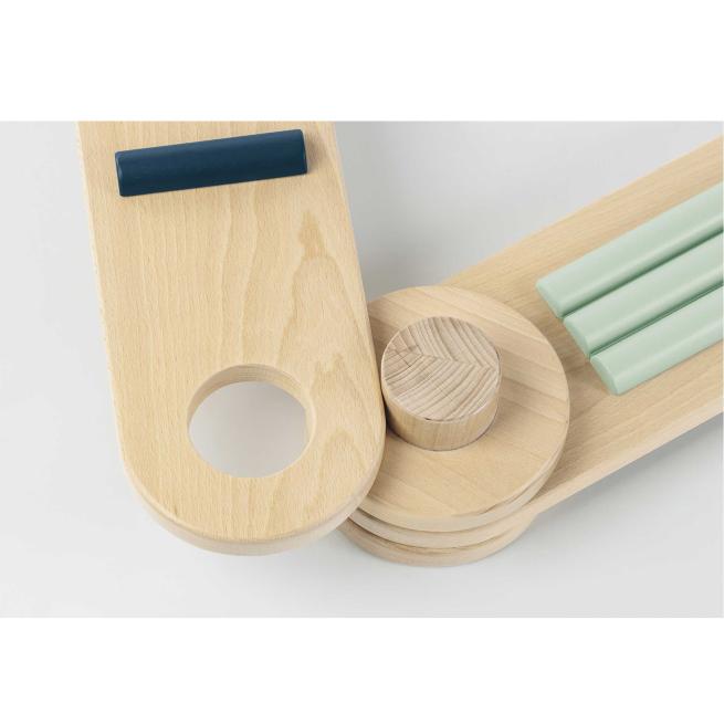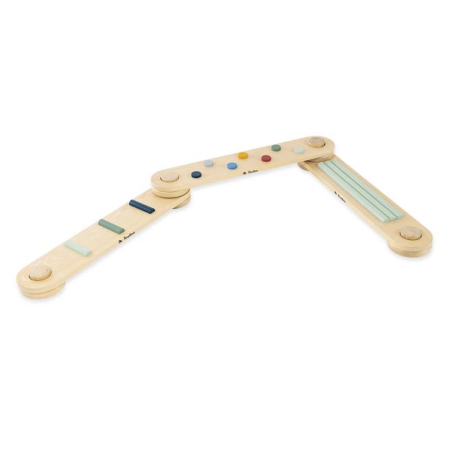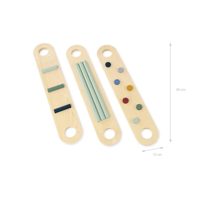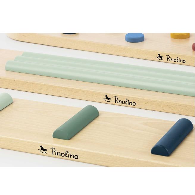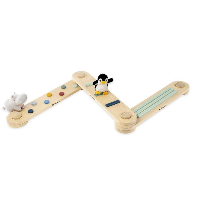 Mithilfe der 6 Verbindungselemente stecken Sie die 3 Balancierbalken individuell zusammen. Die unterschiedlichen Hinderniselemente auf den Balken fördern die kindliche Gleichgewichtsfähigkeit. Die Aufstellflächen sind rutschhemmend lackiert. Ab 2 Jahren.