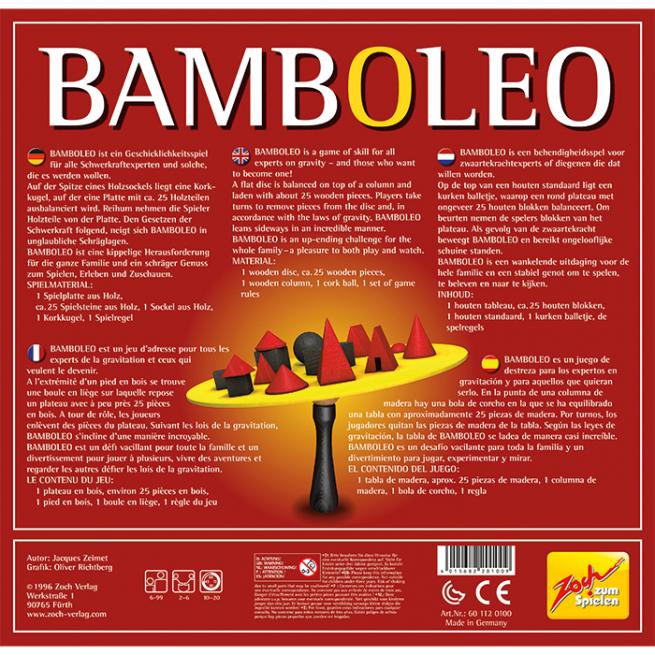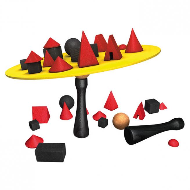 Geschick und ein hohes Maß an Konzentration brauchen 2 bis 6 Spieler, um der Schwerkraft hier ein Schnippchen zu schlagen. Auf dem Holzsockel tariert die Korkkugel die Holzplatte aus. Auf dieser Platte liegen etwa 25 Holzteile von unterschiedlicher Form und Gewicht. Jetzt wird es spannend: Nach und nach nehmen die Spieler die Holzteile von der Platte, wobei diese aber das Gleichgewicht halten muss.