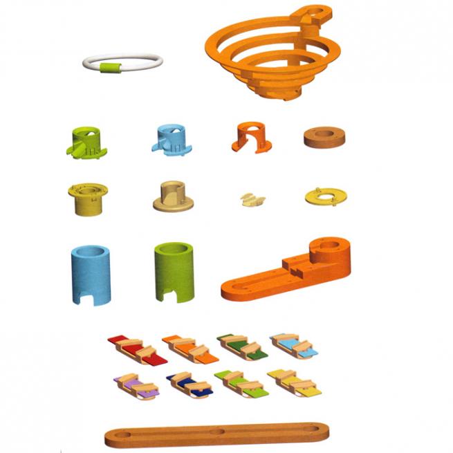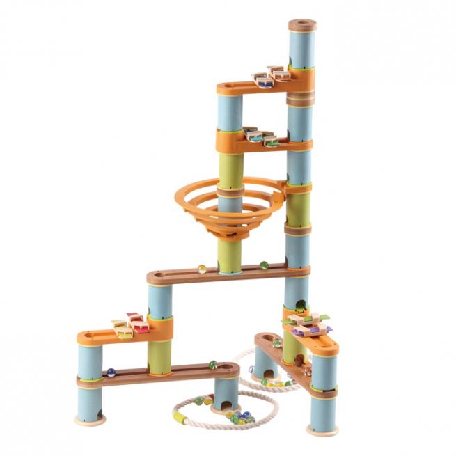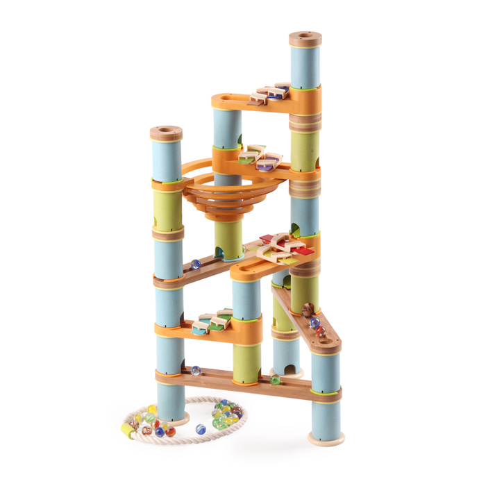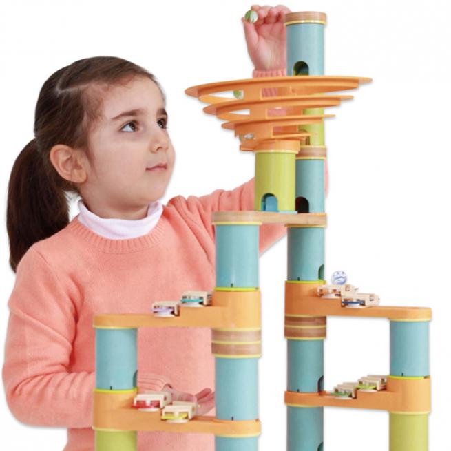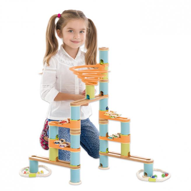 Ihre Fähigkeit dreidimensional zu denken, ihr Geschick und sogar ihren Hörsinn trainieren Kinder ab 4 Jahren mithilfe der Kugelbahnen aus nachhaltigem Bambus. Ob klassische Kugelbahn mit 48 Teilen oder große Klang-Kugelbahn mit 98 Teilen und Metallplatten – die Kinder bauen die Bahnen immer wieder anders auf und beobachten fasziniert, wie die Kugeln durch den Spiralkessel hinabsausen. Die Metallplattenbausteine klingen wie ein Xylophon, sobald Murmeln darüber kugeln und sorgen als Stopper, Weiche, Ausgangs- oder Startpunkt für abwechslungsreiche Wege.