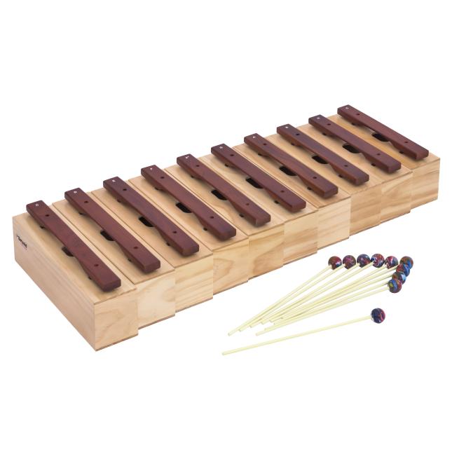 Satz mit 10 Bausteinen von c – c¹ mit fis¹ und b¹ sowie 10 Schlägeln.