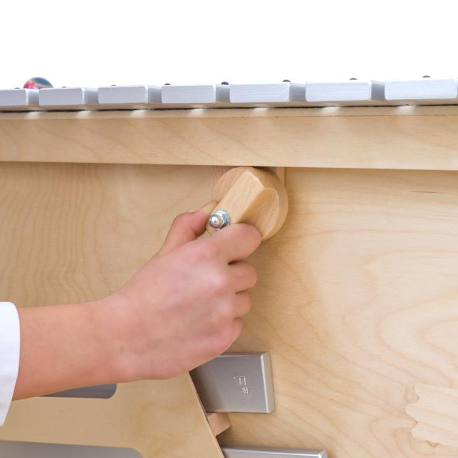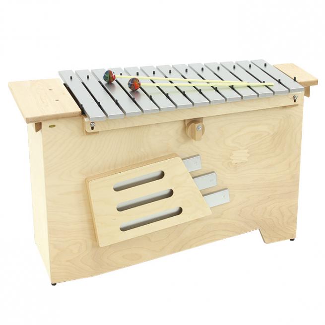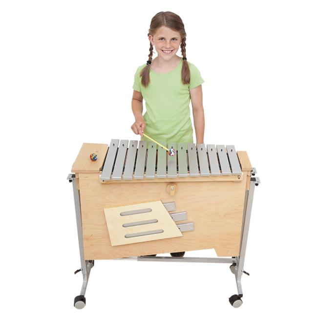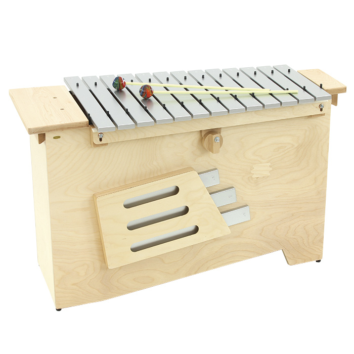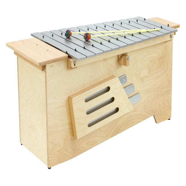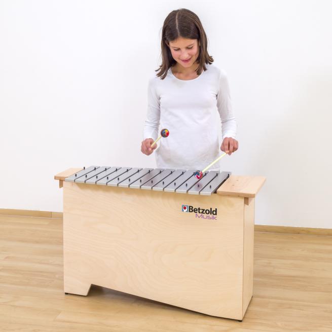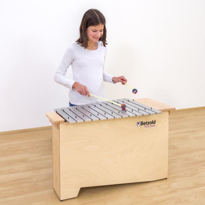 Die Klangstäbe aus Aluminium sind 8 mm stark sowie 40 mm breit und erzeugen einen warmen Klang. Da tiefe Töne große Resonatoren benötigen, während hohe Töne kleinere brauchen, sind die Resonanzkästen mit unterschiedlich großen Kammern bestückt. So kann sich der Klang bestens entfalten. Da Metallophone wesentlich länger klingen als Glockenspiele oder Xylophone, sind sie serienmäßig mit einem Regler zur Dämpfung ausgestattet. Bei eingeschalteter Dämpfung verkürzt sich die sogenannte Nachklingzeit etwa um die Hälfte. Mithilfe der seitlichen Griffe transportieren Sie die jeweiligen Instrumente leicht und fixieren Sie im Handumdrehen auf Ständerwagen.