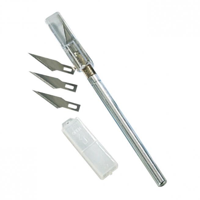 Inklusive 3 Ersatzklingen und Schutzkappe aus Kunststoff.