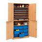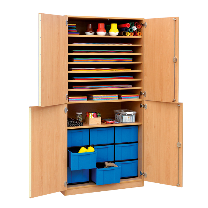 Der viertürige Schrank bietet jede Menge Platz für Bastelpapier und viele andere Materialien. In den oberen 8 Fächern lassen sich auch große Bögen auf 7 verstellbaren Fachböden platzsparend lagern. Unten bewahren Sie in 9 großen Kunststoffschüben und einem geräumigen Ablagefach Ihre Bastelutensilien übersichtlich auf. Die obere und die untere Schrankhälfte ist jeweils separat verschließbar.