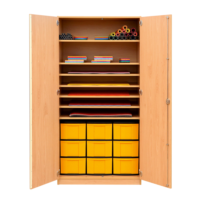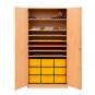 Hier bewahren Sie Ihr Bastelpapier und viele andere Materialien übersichtlich auf. Im oberen Bereich bieten 2 große Fächer und 5 Papierfächer viel Ablagefläche. Die Fachböden sind höhenverstellbar. In 9 großen Kunststoffschüben lagern Ihre Farben, Werkzeuge und viele andere Utensilien immer gut sortiert. Die Schubfächer lassen sich herausnehmen, so steht Ihren Schülern das Material im Handumdrehen zur Verfügung und ist genauso schnell wieder eingeräumt.