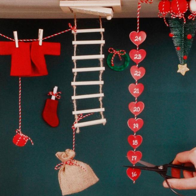 Entdecken Sie vom 1. Dezember bis zum Heiligen Abend jeden Morgen, wie die aufgereihte Herzchenschnur kürzer wird. Denn jede Nacht schneidet der hauseigene Wichtel immer eins ab …