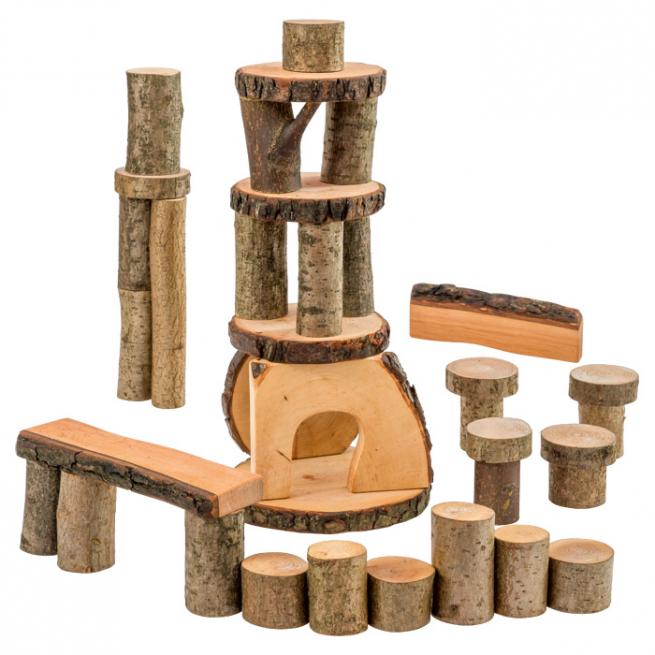 Natürlich mit Holz bauen. Räumliches Denken und Geschicklichkeit trainieren Kinder mit diesen parallel gesägten, naturbelassenen Baumklötzen. Mit den enthaltenen Tür- und Fensterelementen entstehen zauberhafte Häuser oder großartige Fantasiegebilde. In der fahrbaren Kiste mit Deckel und zwei Rädern sind die Baumklötze nach dem Spielen bestens aufgehoben. Die Kinder transportieren ihre Lieblingsbaumklötze damit ganz leicht selbst.