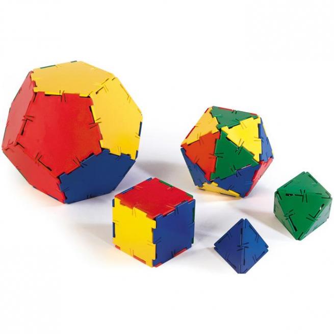 Der Satz ermöglicht den gleichzeitigen Bau aller 5 regelmäßiger Körper: Tetraeder, Würfel, Oktaeder, Dodekaeder und Ikosaeder. Alle Teile aus robustem Kunststoff in den Farben Rot, Blau, Grün und Gelb.