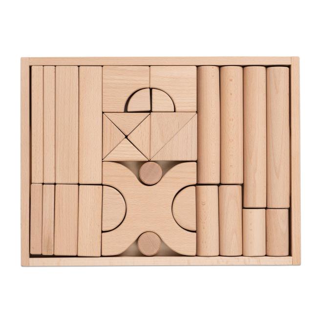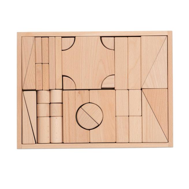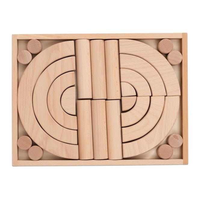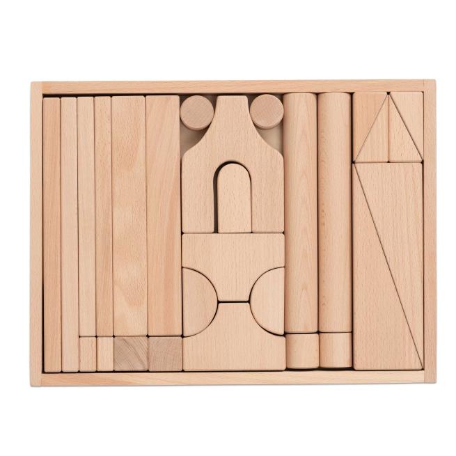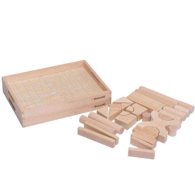 Die robusten Bauteile sind für Kinder gut greifbar und fördern spielerisch Denkvermögen, Kreativität sowie motorische Fähigkeiten. Mit den Bausteinwagen machen die Kinder sogar erste Erfahrungen mit der Geometrie. Denn auf dem Boden jeder Lade sind Linien in Form der unterschiedlichen Bausteine aufgedruckt. Anhand dieser Hilfestellung räumen Kinder die Bausteine dem Muster entsprechend ein. So lernen sie die geometrischen Formen bewusst kennen. Dabei verinnerlichen und trainieren sie die Deckungsgleichheit, die Formen-Größen-Zuordnung und ihre Auge-Hand-Koordination.