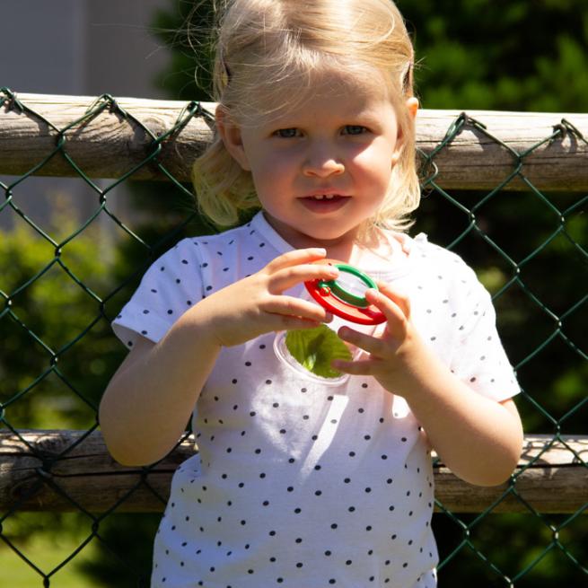 Der rot umrandete Deckel ist mit einer Lupe versehen, die zweifach vergrößert. Klappt das Kind die zusätzliche Lupe mit dem grünen Rand darüber, werden die Objekte vierfach vergrößert betrachtet. Sie lässt sich besonders gut für die Projektarbeit im Biologieunterricht, im naturnahen Sachunterricht oder einer Natur-Exkursion im Kindergarten einsetzen.