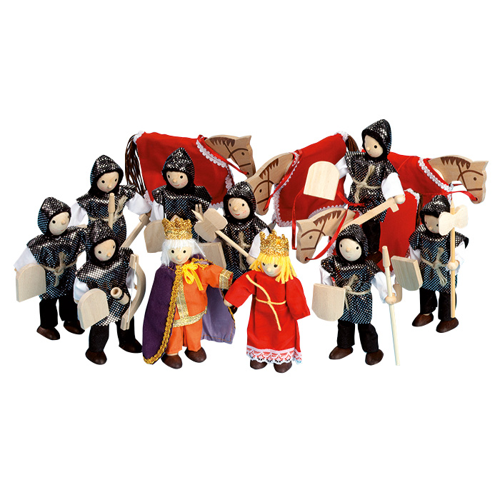 Die ca. 12 cm großen Ritterfiguren haben einen biegbaren Körper und können stehen. Somit können sie jede Körperhaltung einnehmen. Ihre Hände, Füße und Köpfe sind aus Holz gefertigt. Die kleinen, individuell gefertigten Kleider sind in Handarbeit hergestellt.