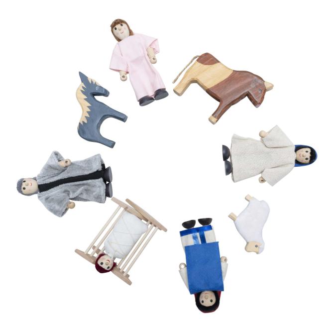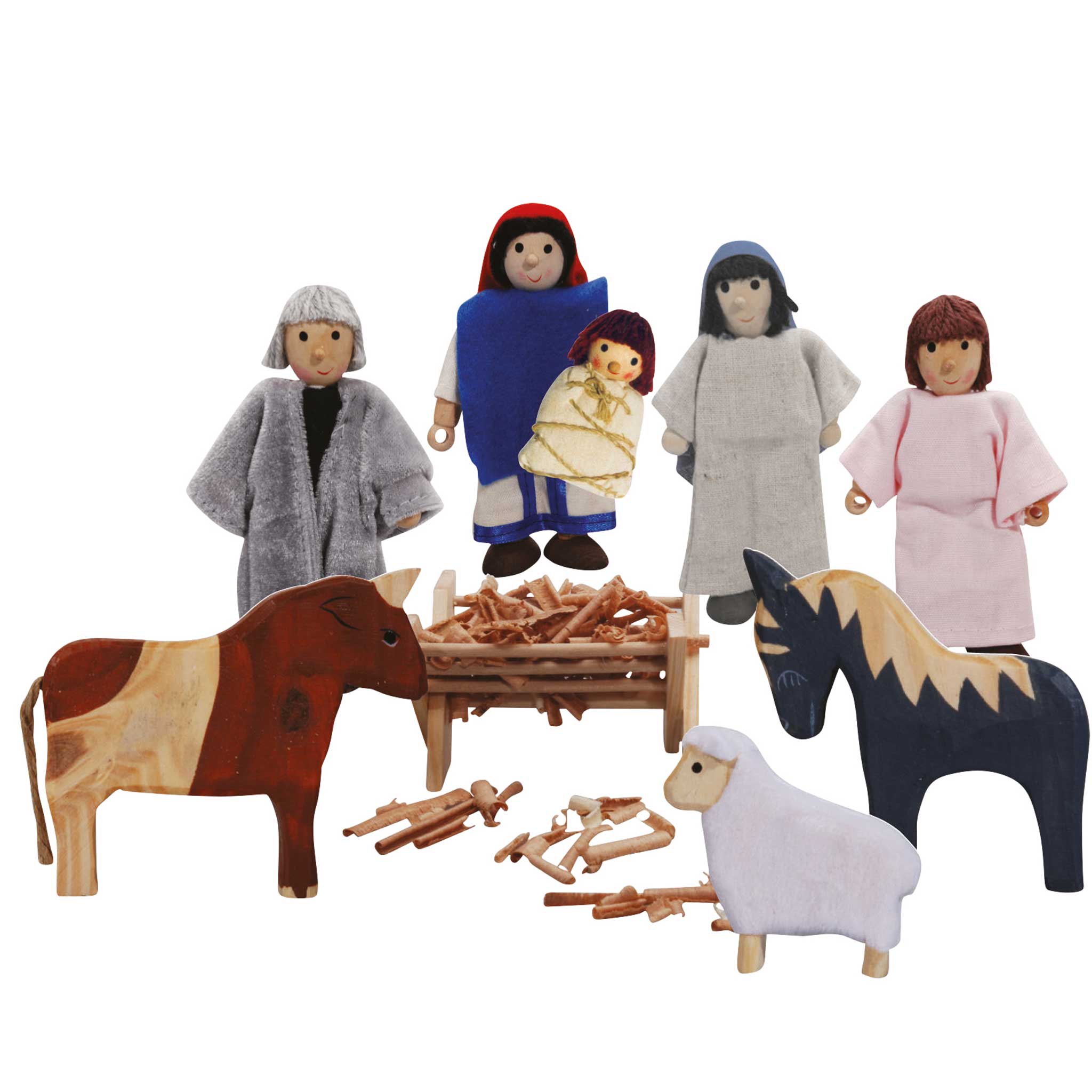 Die Weihnachtsgeschichte rund um Jesu Geburt spielen Sie mit Ihren Kindern und den Biegepuppen sowie Holz-Figuren nach.
