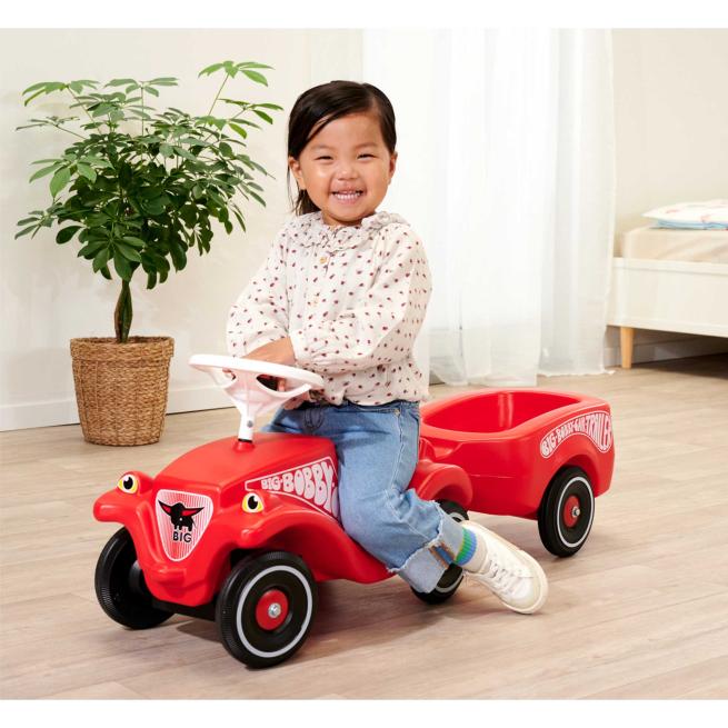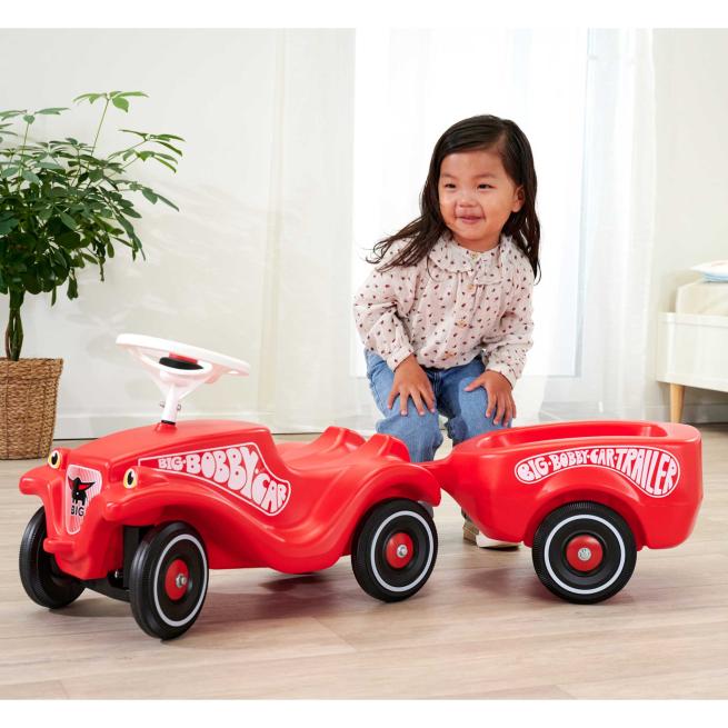 Ruck zuck wird aus dem beliebten Bobby Car ein richtiger Transporter. Den stabilen Anhänger mit seinen abgerundeten Ecken koppeln Sie einfach mit dem robusten Sicherheits- Kupplungsstift an.
