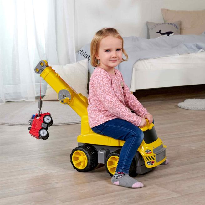 Der BIG Power-Worker-Maxi-Kran zieht und hebt mit Maxi-Power: Die funktionsfähige Seilwinde mit Haken triumphiert mit 450 g Zugkraft und widmet sich so mühelos kleineren Spielfahrzeugen und mehr (Zubehör nicht im Lieferumfang enthalten). Noch dazu ist der Kranausleger klappbar und lässt sich um 360° drehen. Die Bedienung des cleveren Hebewerkzeugs gelingt den Kindern dabei intuitiv und im Nu von der bequemen Sitzfläche des Fahrzeugs aus (belastbar bis 50 kg). Die originelle, am großen Vorbild orientierte Gestaltung des Maxi-Krans komplettiert den Spielspaß und inspiriert zu zahllosen Spiel-Ideen. Überzeugen Sie sich selbst: Dieser Kran hebt die Laune!