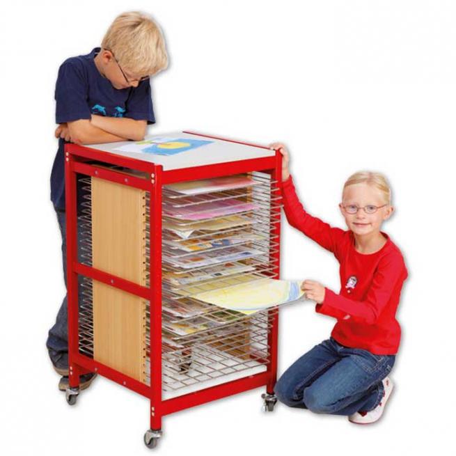 In diesem Trocknungswagen finden Ihre Bilder ausreichend Platz. Das schafft Raum auf Fensterbänken, Heizungen und Tischen. Zudem bleibt der Klassenraum sauber, denn die frischen Meisterwerke trocknen separat und geschützt im Trocknungswagen.