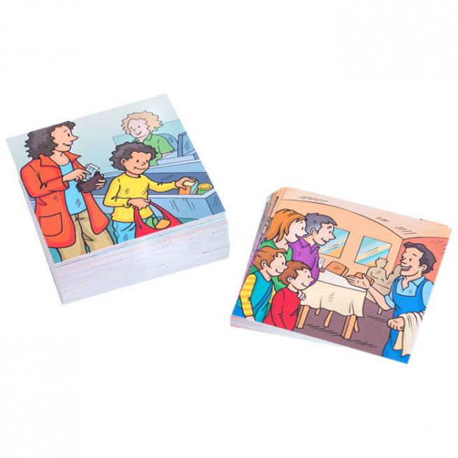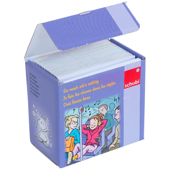 Unterschiedliche Situationen zeigen in einer Abfolge von jeweils 5 Karten ein gesellschaftlich richtiges Verhalten. Im betreffenden Zusammenhang zeigen immer 3 Szenen ein sozial inkorrektes Verhalten.
