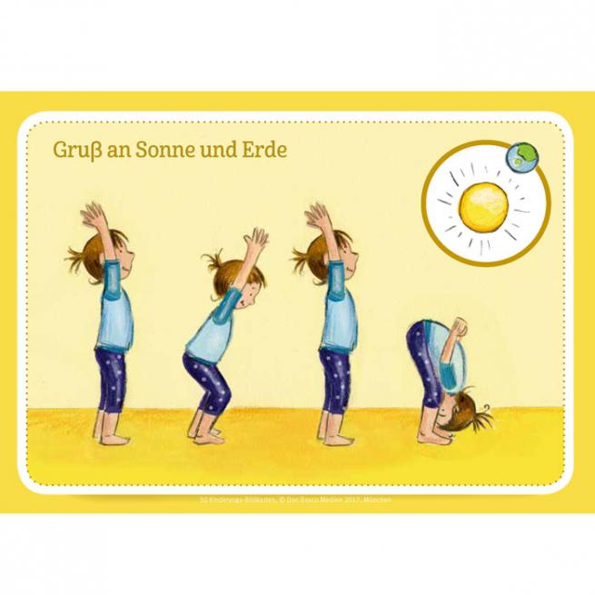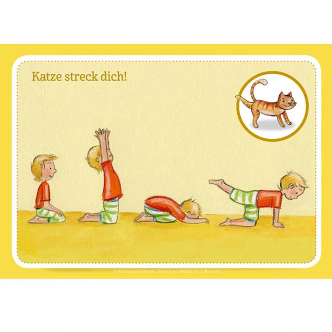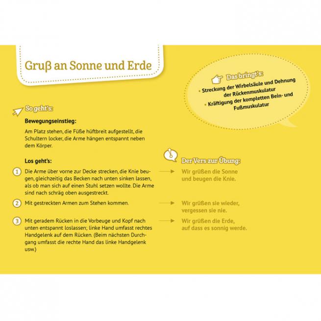 Die beidseitig bedruckten Karten zeigen kindgerechte Yoga-Übungen zum Aufwärmen, im Stehen, Liegen, Sitzen oder Knien, zu handgestützten Übungen sowie zum dynamischen Ausgleich und zur Entspannung. Vorderseitig ist die jeweilige Übung abgebildet, rückseitig stehen Anleitung, Wirkung und ein passender Merkreim. Ab 4 Jahren.