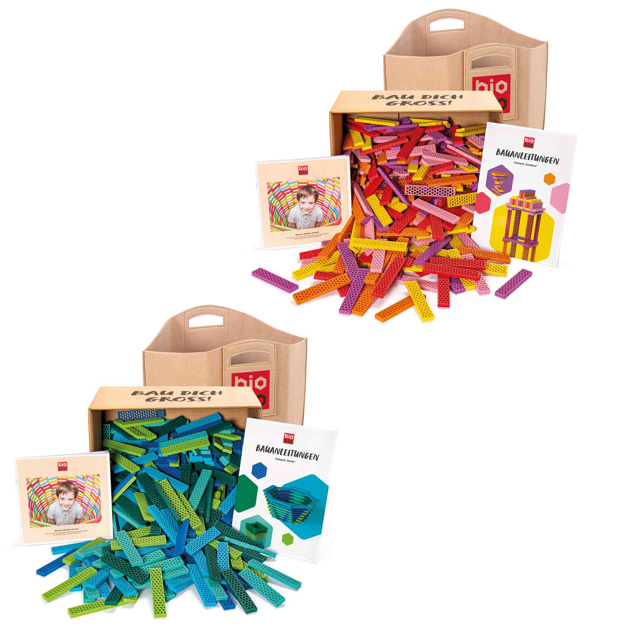 Getreu dem Motto „big is beautiful“ sind die Bioblo Jumbo-Steine in jede Richtung doppelt so groß wie die regulären Bausteine und besitzen daher das achtfache Volumen! So lassen sich blitzschnell atemberaubend hohe Türme, massive Wände und riesige Figuren erschaffen. Die Sets sind in zwei Farben verfügbar.