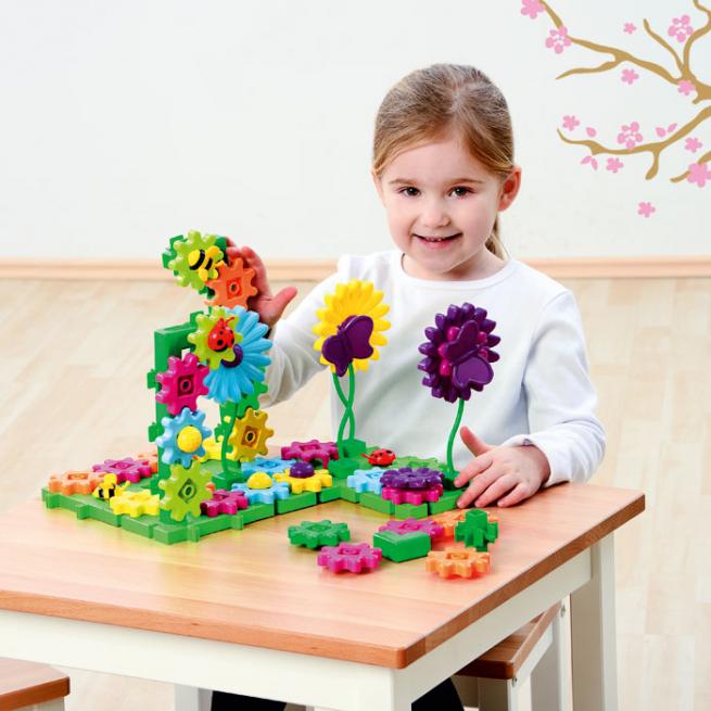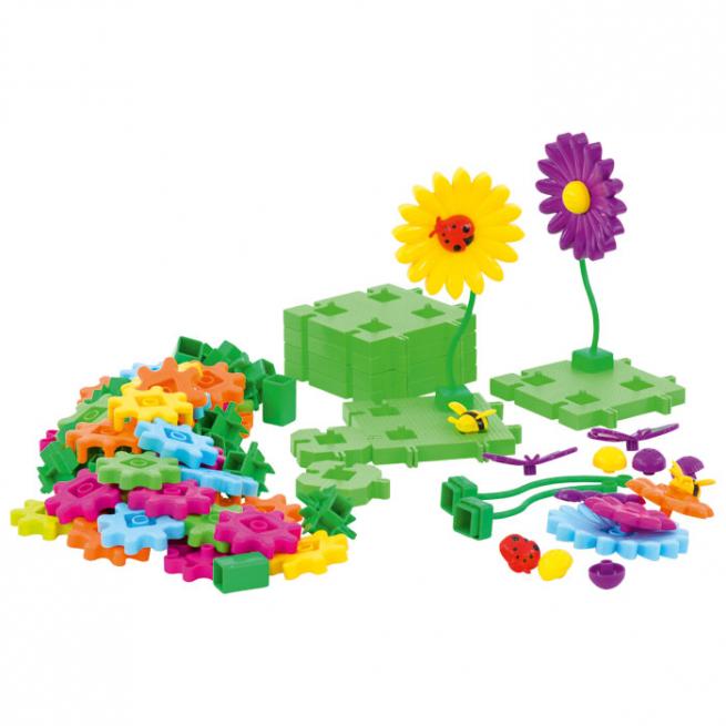 Farben kombinieren und räumliches Denken kennenlernen – mit dem Blumensteckspiel und den dazugehörenden Zahnrädern, Schmetterlingen, Bienen und Marienkäfern blüht die kindliche Fantasie auf.