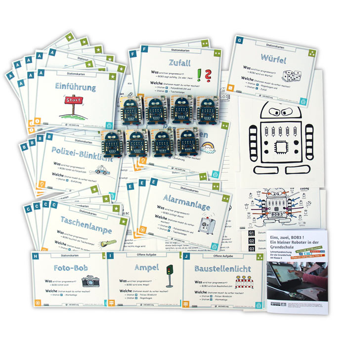 Wecken Sie das Interesse Ihrer SuS ab Klasse 3 an Lösungsstrategien in Form von Algorithmen. Die Grundlagen des Programmierens erkunden Sie gemeinsam mit dem Grundschul-Set mit 8 BOB3 Robotern. Das Lernkonzept rund um den BOB3 ist speziell für die Grundschule und den Bereich MINT entwickelt worden. BOB3 ist ausgestattet mit Touchsensoren, LEDs, IR-Sensoren zur Distanzmessung sowie einem Temperatursensor, um Umweltbedingungen wahrzunehmen. Der Roboter kann, je nach programmierten Befehlen, seine Augen in allen Farben blinken lassen und Berührungen am Arm erkennen. Mithilfe des Stationenlernens entdecken sie unterschiedliche Lerninhalte sowie Schwierigkeitsgrade. Dabei helfen Aufgaben, passende Werkstattpläne, Ausmalbilder und Lesetexte mit Fragen.