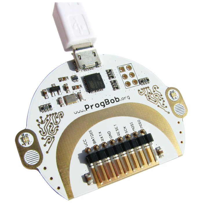 Mit dem Programmieradapter für den BOB3 Roboter funktioniert die Verbindung zwischen Hard- und Software. Den USB-Programmieradapter in Form eines Helms setzen Sie dem BOB3 Lernroboter einfach auf und verbinden ihn dann mit Ihrem Laptop, PC oder Tablet. Nun programmieren Sie mit Ihren Schülern Befehle und übertragen diese dann an den BOB3. Der AVR-Chip bildet den Mikrocontroller und die beiden Multicolor-LEDs die Statusanzeige. Die ProgBob Software zur interaktiven Programmierung für Windows, Android, Linux ist frei erhältlich.