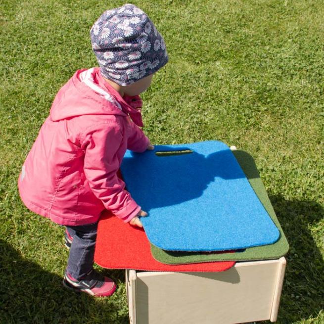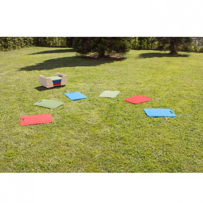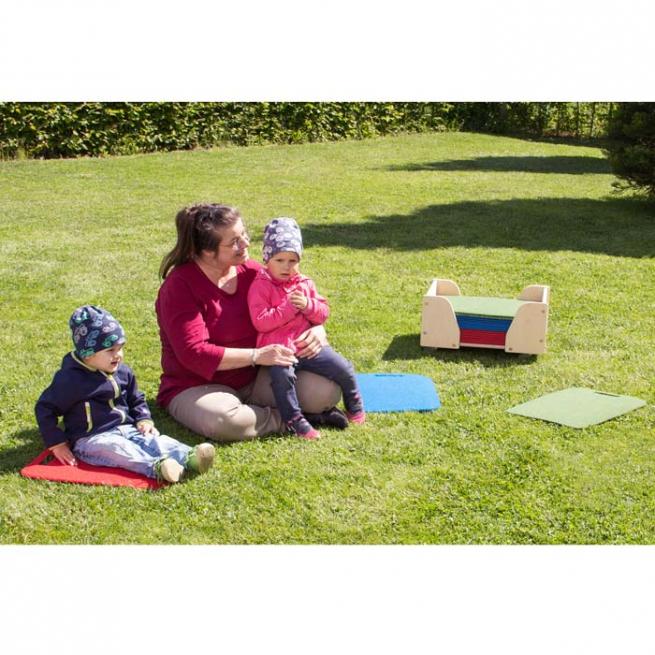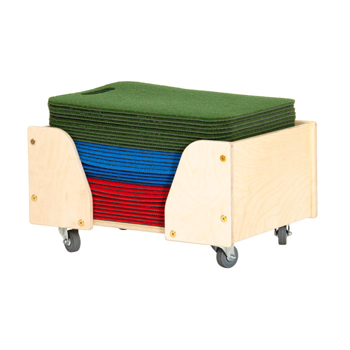 - 30 rutschfeste Sitzmatten in den Farben rot, blau und grün inkl. Rollwagen