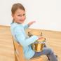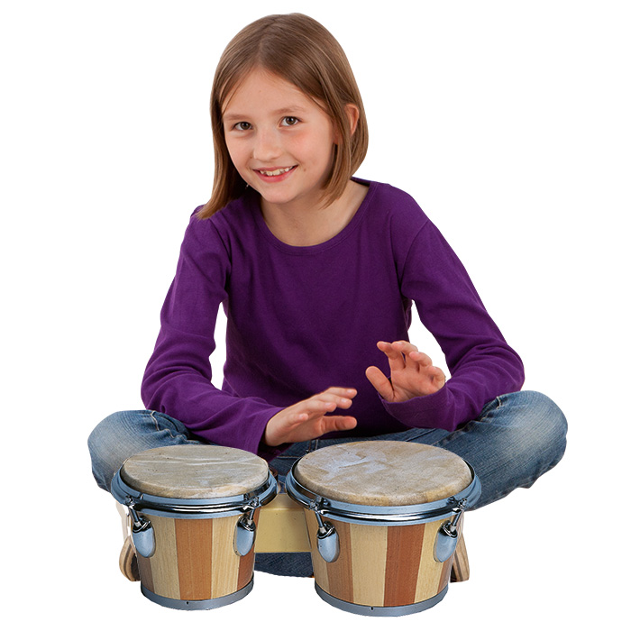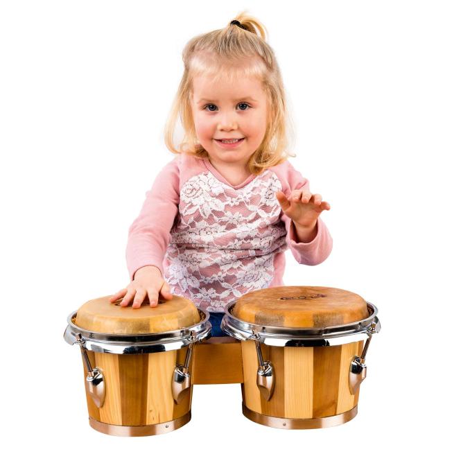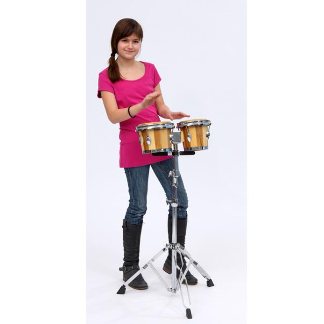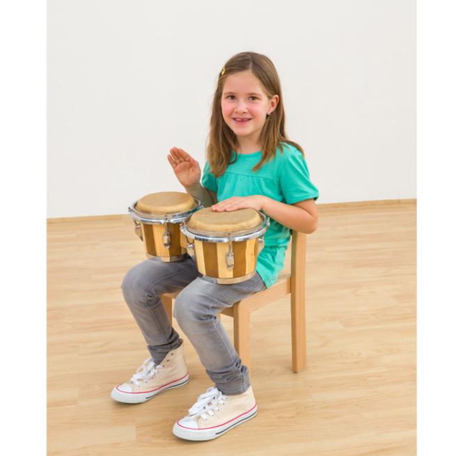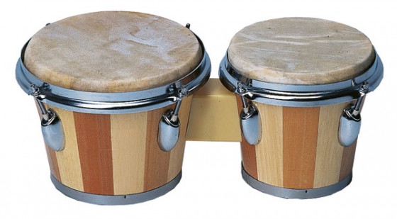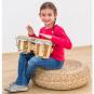 Mit Naturfell bespannt. An jeder Trommel sind 4 Spannblöcke angeschraubt. Damit werden die Instrumente gestimmt.