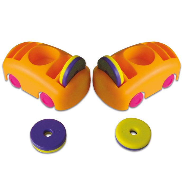 Je nachdem, wie und wie viele der 4 Ringmagnete die Kinder in die 2 Autos stecken, ziehen sich die Fahrzeuge entweder an oder stoßen sich ab. Ab 4 Jahren.