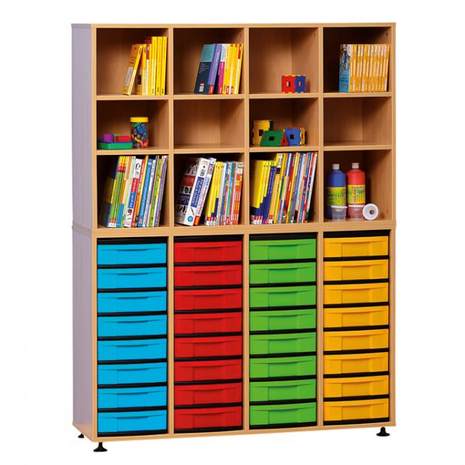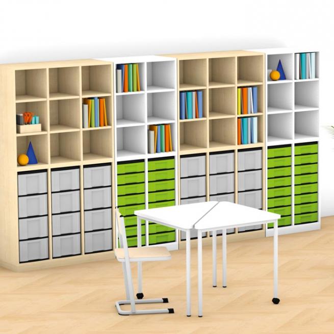 Ob als Klassenregal mit Eigentumsfächern für jeden Schüler, Bücherbord für die Schülerbibliothek oder für alle Materialien im Lehrerzimmer, diese Regale sorgen für Ordnung. Schübe mit Auszugssperre, durch einfaches Zusammendrücken herausnehmbar. Die Regalbretter sind in der Höhe verstellbar.