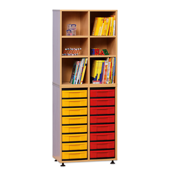 Ob als Klassenregal mit Eigentumsfächern für jeden Schüler, Bücherbord für die Schülerbibliothek oder für alle Materialien im Lehrerzimmer, diese Regale sorgen für Ordnung. Schübe mit Auszugssperre, durch einfaches Zusammendrücken herausnehmbar. Die Regalbretter sind in der Höhe verstellbar. mit 6 Regalfächern