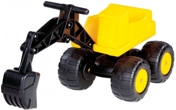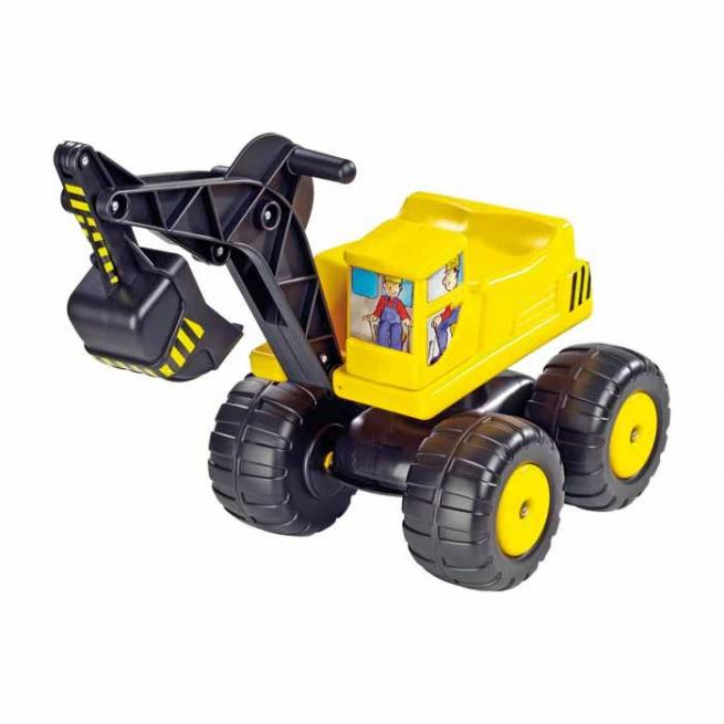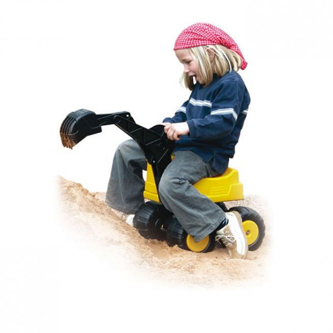 Äußerst robuster und kindergartentauglicher Bagger. Er ist so belastbar, dass sich die Kinder zum Baggern draufsetzen können. Durch zwei stabile Griffe können Baggerarm und -schaufel bewegt werden.