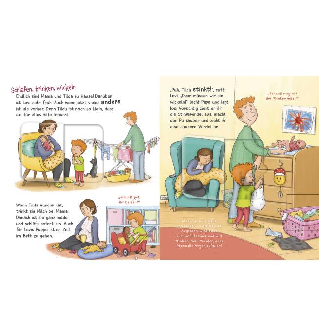 Als stolzer großer Bruder hat Levi alle Hände voll zu tun, denn seine Schwester ist nun endlich auf der Welt. Levi hilft gern, Tilda zu füttern und zu wickeln. Er entsorgt die stinkende Windel und zieht die Spieluhr auf, wenn seine Schwester weint. Eine warmherzige Geschichte über Schwangerschaft und Geschwister.Produktdetails