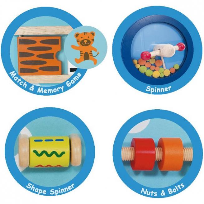 Die kunterbunten, großen Tiere aus Holz laden ihre Kinder zum Ausprobieren und Entdecken ein. Mit je 4 verschiedenen Spielen.