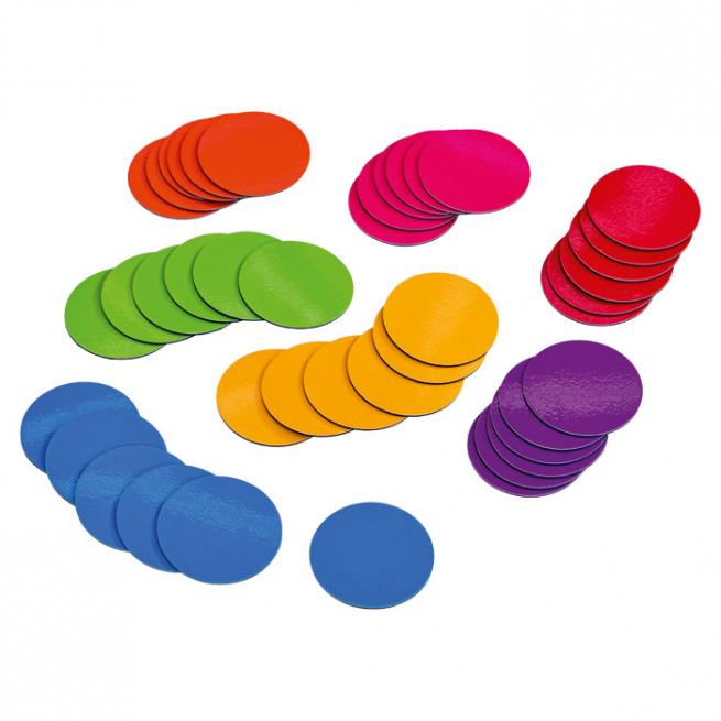 42 runde Magnete in 7 verschiedenen, kräftigen Farben mit guter Haftkraft. Je 1 mm stark, Ø 35 mm.