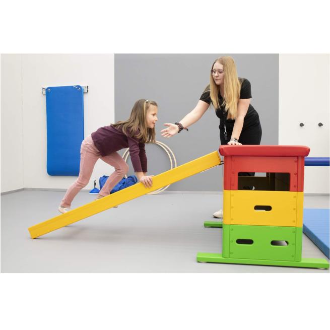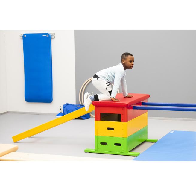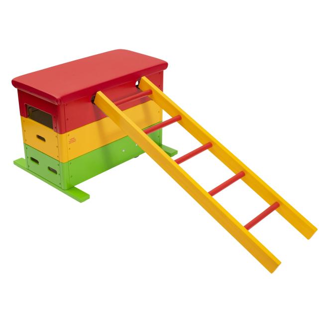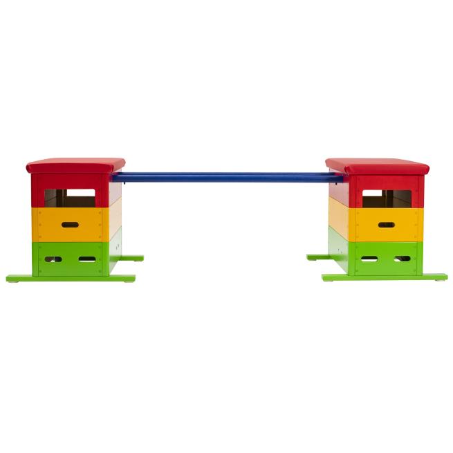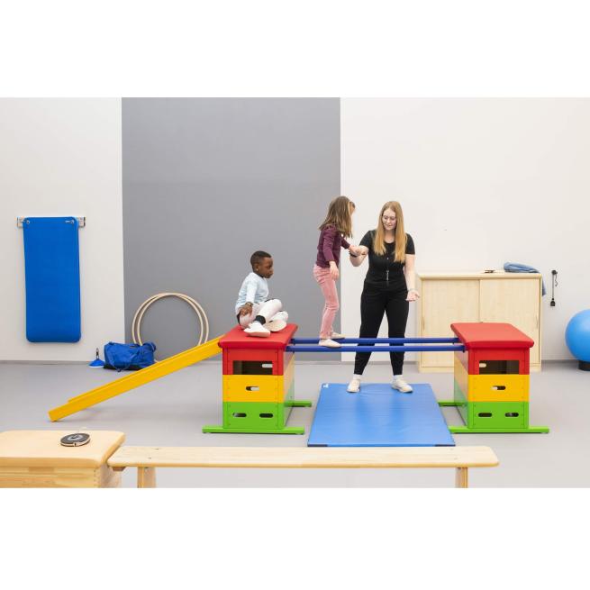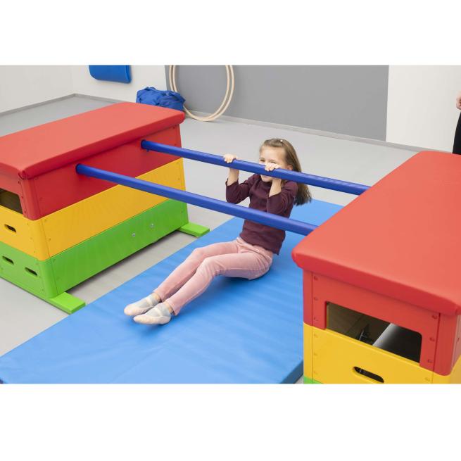 Die Gerätekombination ist aus solider Multiplex-Sperrholzplatte mit robusten Hartholzecken gefertigt und besteht aus 2 Sprungkästen, 2 Holmen und 1 Leiter. Sie eröffnet zahlreiche Möglichkeiten für unterschiedliche Turnübungen und Bewegungsaufgaben. Das schrittweise Kennenlernen der Geräte und erfolgreiche Turnen unterstützt die Kinder zudem darin, ein gesundes Selbstvertrauen und Selbstwertgefühl aufzubauen.
