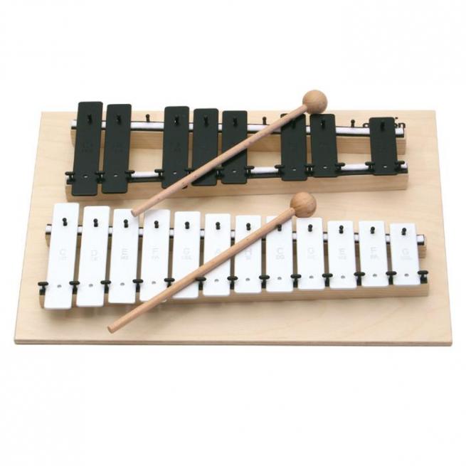 Der Halbtonleiterumfang dieses Sopran-Glockenspiels erklingt, wenn die 20 fein gestimmten schwarzen und weißen Klangplatten aus Stahl mit den beigefügten Schlägeln angeschlagen werden. Das Glockenspiel ist auf einer Sperrholzplatte mit einem Rahmen aus Fichte fest montiert. 20 Stahl-Klangplatten je 2 cm mit Tonumfang c3 – g4.
